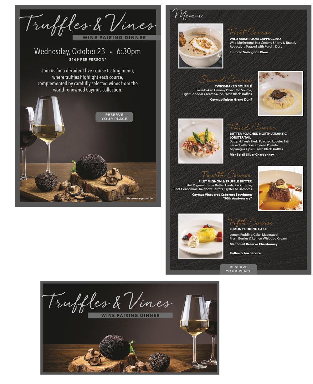 Generally all promotions have an email, email pod showing the menu and an event social asset. In-house menus are provided at event.