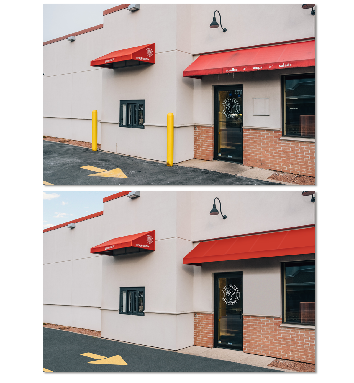 Task: General cleanup. Image used to showcase the drive up window and awnings.