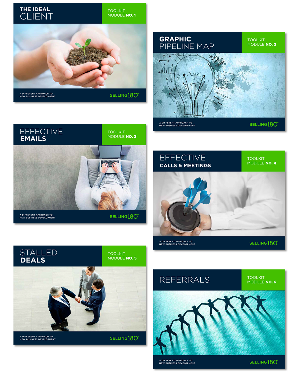 A sales tool kit of 6 books, with an overview, instructions, a call worksheet and word docs with email starter conversations.